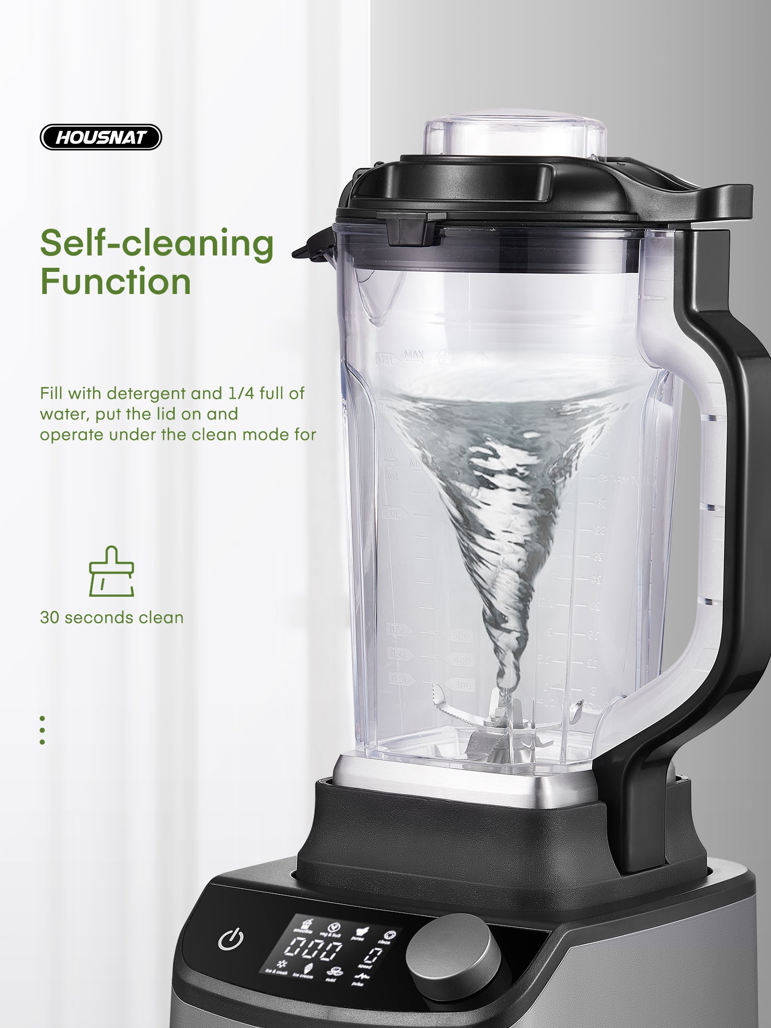 - 🍓【Easy to Use & Self Cleaning】Just turn the knob to set the desired time, speed or mode, then press the knob to start blending. Use the provided stirring rod to stir the agglomerated mixture to a smooth state. Add detergent and 1/4 of water to the blender, close the lid and operate in cleaning or pulse mode within thirty seconds to clean up.