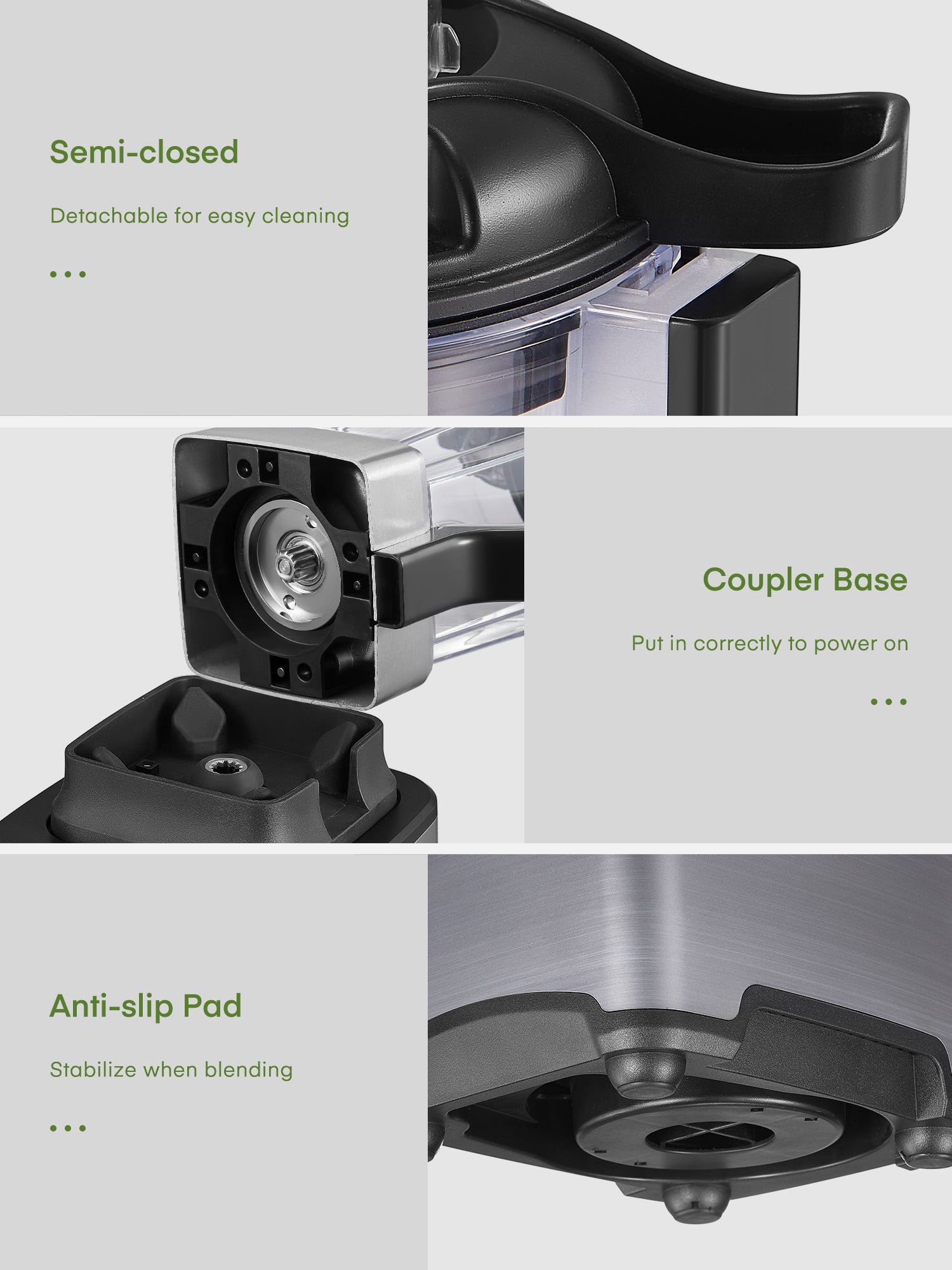 - 🥝【Safety Design】Only the jar and the base are properly connected, the motor can be started. The locked lid fully covers and seals the jar to prevent the mixture from overflowing. The motor temperature control system prevents the motor from overheating. The jar is made of BPA Free Tritan, which is durable and leakproof.
