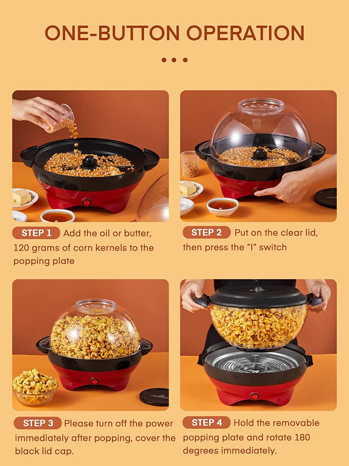 The HOUSNAT popcorn machine works almost silently compared to other hot air popcorn machines. With just one button, you can enjoy delicious popcorn, easy and convenient. The removable black non-stick plate and transparent cover can be flipped, the transparent cover automatically turns into a popcorn machine bowl, and no need to flip the whole machine.