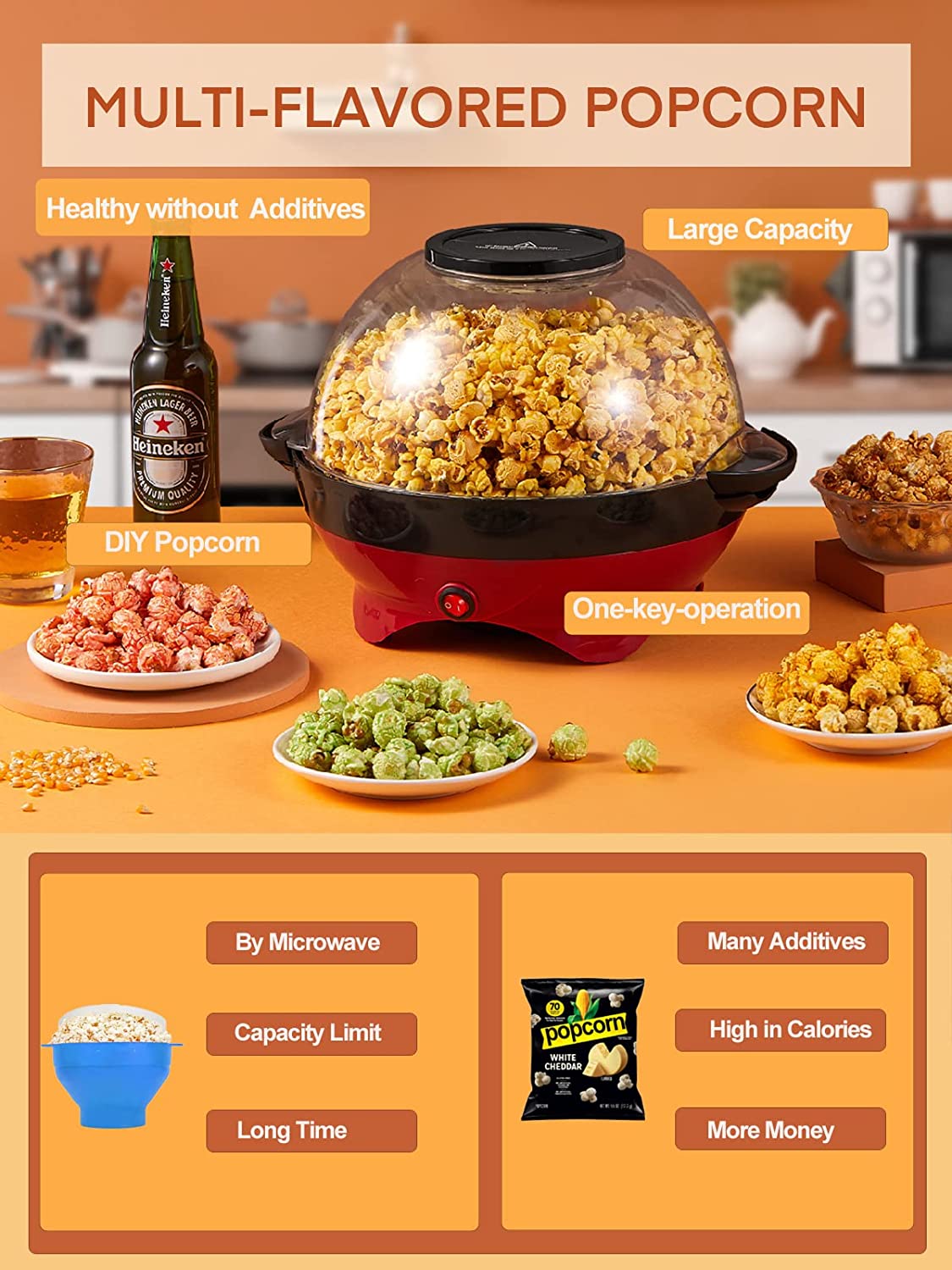 HOUSNAT 800W electric popcorn maker can make 6.3 Quarts of cinema-fresh popcorn for your family and friends at the same time within 4 minutes so you can enjoy the delicious taste. At the same time, the updated rapid heating technology makes the HOUSNAT popcorn maker 50% faster than the traditional stir popcorn maker, no need to preheat, no need to wait