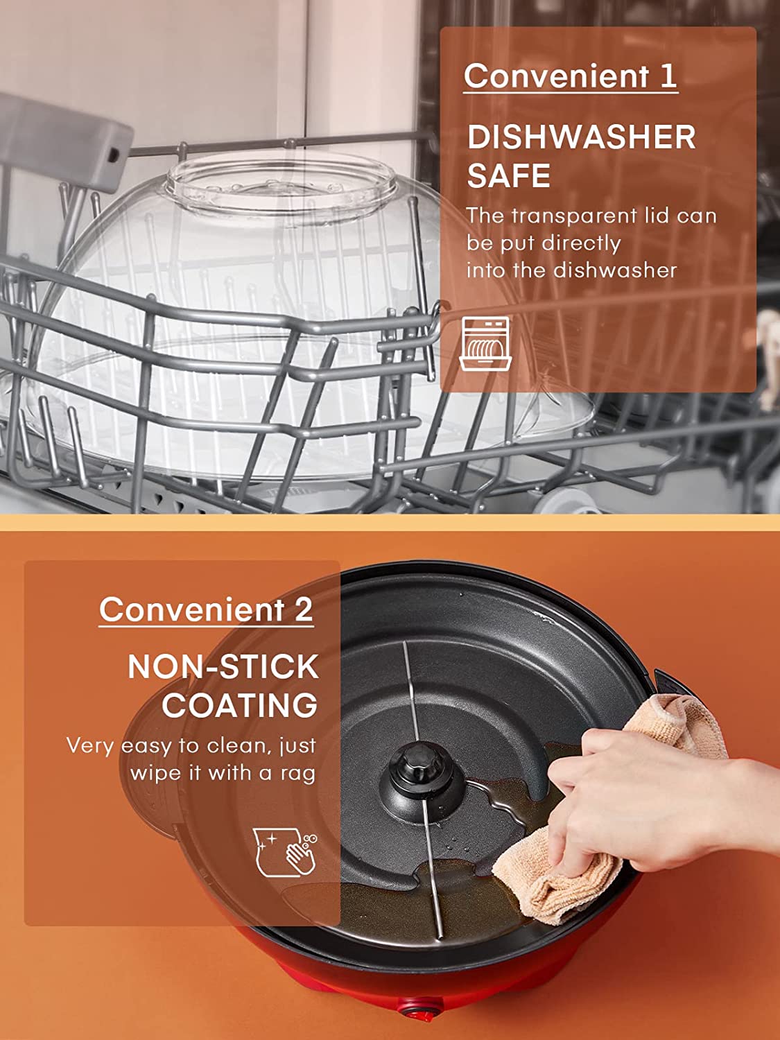 The popcorn maker's new non-stick plate is easy to clean by wiping with a damp cloth. The large clear lid can be used as a popcorn bowl and the lid is dishwasher safe or wiped clean. This retro-looking popcorn maker can be used as a decoration or stored in a closet.